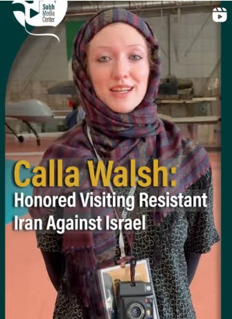Another apologist for the regime is Calla Walsh, the co-founder of Palestine Action U.S. She was one of several handpicked delegates who was taken to Iran, where she expressed solidarity with the Islamic Republic following the 12-day war with Israel.